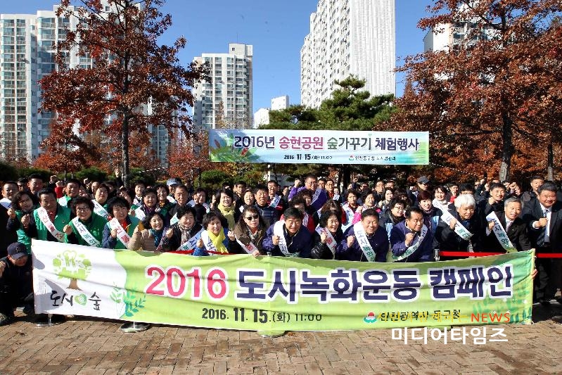 [미디어타임즈=문상수 기자] 인천 동구(구청장 이흥수)는 15일, 송현근린공원 수도꼭지조형물 앞에서 ‘푸른 녹색도시 동구만들기’를 위한 ‘2016 숲가꾸기 체험행사’를 실시했다고 밝혔다. 구에 따르면 이번 체험 행사는 숲가꾸기 기간인 11월을 맞아 2016년 봄철 식재한 송현공원의 무궁화 조림목, 자작나무 등이 잘 자랄 수 있도록 생육환경을 개선하고, 지역주민들에게는 비료주기 체험의 기회를 제공해, 푸르고 깨끗한 지역환경을 조성하고자 마련됐다. 이날 체험 행사에는 이흥수 구청장을 비롯한 동구청 직원들과 주민 등 300여 명이 함께 참여했으며, 도시녹화운동 및 산불예방 캠페인을 시작으로 공원수목 비료주기, 조경용 고형복합비료 나눠주기를 진행해, 민 ‧ 관이 함께 참여와 나눔을 실천하는 범국민적 도시녹화 운동을 전개했다. 한편 구 관계자는 “도심 속 공기정화 및 주민들의 여가 활동 공간을 제공하고 있는 송현공원은‘푸른 녹색도시 동구만들기’에 중심적인 역할을 하고 있다”며 “앞으로도 송현공원을 주민들이 언제든 찾아와 쉴 수 있는 도심 속 푸른 공간으로 가꿔나가도록 노력하겠다”고 말했다.