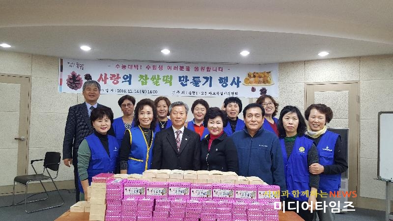 [미디어타임즈=문상수 기자] 동구 송현1·2동(동장 장석도)은 14일, 2017학년도 대학수학능력시험에 응시하는 관내 수험생들을 격려하기 위해 대입 합격 기원 사랑의 찹쌀떡 만들기 행사를 진행했다고 밝혔다. 이날 행사는 송현1·2동 바르게살기위원회(위원장 전정애) 주관으로 마련됐으며, 바르게살기위원회원 10여 명은 막바지 대입 수험준비로 여념이 없을 수험생들을 격려하는 마음을 담아 사랑의 손길로 찹쌀떡을 만들어 관내 수험생 130여 명에게 전달해 지역사회 분위기를 훈훈하게 했다. 한편 전정애 송현1·2동 바르게살기위원장은 “그동안 열심히 공부해온 수험생 모두가 원하는 결과를 얻을 수 있도록, 마지막까지 최상의 컨디션을 유지해 시험을 잘 치르길 기원한다”고 말했다.