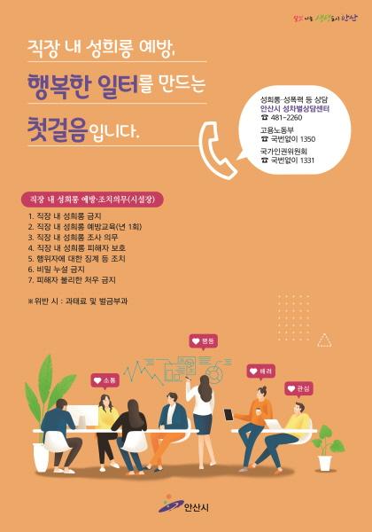 안산시는 22일 밝고 건강한 직장분위기 조성을 위해 민간위탁기관에 성희롱 예방 포스터를 제작해 배부했다고 밝혔다.