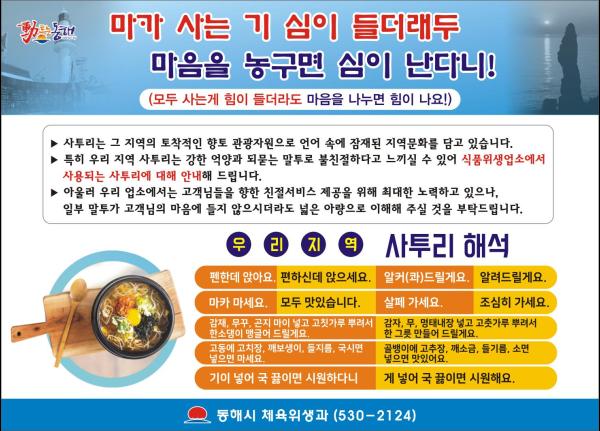 동해시가 특색있는 지역 말투와 사투리를 활용한 안내문을 일반음식점에 부착해 친절서비스를 홍보하는 이색 마케팅으로 눈길을 끌고 있다.