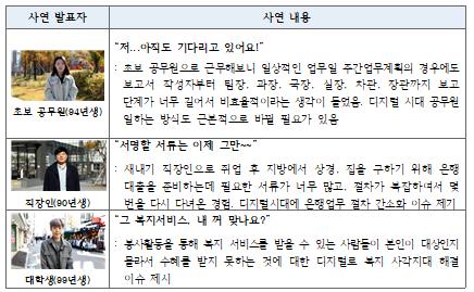 직장인 A씨는 “취업 후 집을 구하기 위해 은행 대출을 받는 과정에서 구비해야 할 서류가 너무 많고 절차도 복잡했다”며 디지털 기술을 활용해 서류 제출을 줄여야 한다고 말했다.