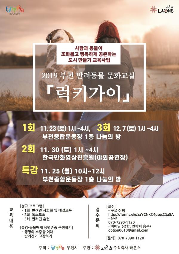 부천시는 오는 23일부터 12월 7일까지 매주 토요일에 부천종합운동장과 한국만화영상진흥원 야외공연장에서 반려동물 문화교실 ‘럭키가이’를 개최한다.
