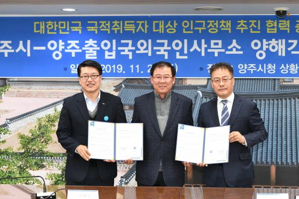 양주시는 지난 21일 시청 상황실에서 양주출입국외국인사무소와 대한민국 국적취득자 대상 인구정책 추진 협력증진을 위한 양해각서를 체결했다.