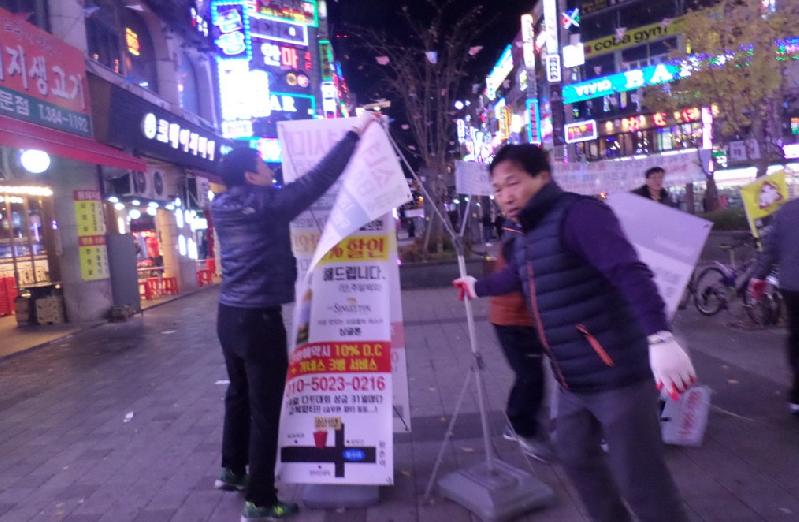 이들은 각 업소들이 불법유동광고물을 집중적으로 거리에 내다놓는 시간대인 저녁9시부터 단속을 강화, 에어라이트 19개, 배너기 12개, 벽보 등의 불법광고물을 수거 처리했다.(사진 첨부)