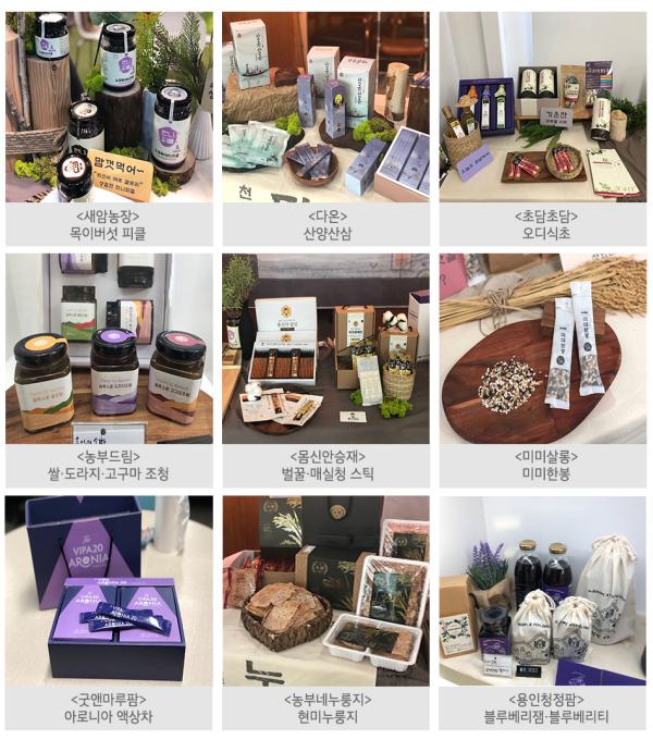 대표 상품으로는 올해 농식품창업콘테스트 결선에 진출한 새암농장의 목이버섯 뮤즐리와 피클, 초담초담의 오디식초, 농부드림의 쌀·도라지·고구마 조청, 용인청정팜의 블루베리 쨈·차, 몸신 안승재의 벌꿀·매실청 스틱 등이 있다.