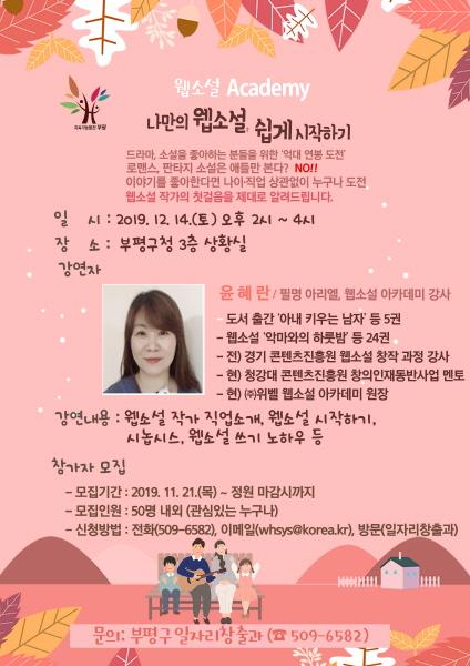부평구는 오는 12월 14일 구청에서 웹소설 작가 직업과 웹소설 쓰기 노하우를 알려주는 ‘나만의 웹소설, 쉽게 시작하기’ 강연을 진행한다.