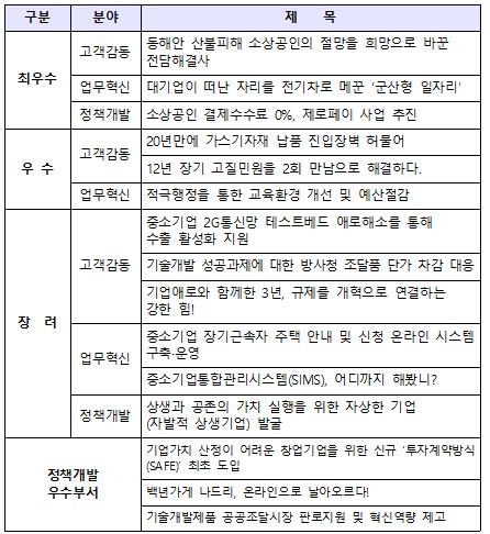 동해안 산불피해 소상공인 전담해결사 운영, 대기업이 떠난 자리를 전기차로 메꾼 ‘군산형 일자리’ 등 3건이 2019년 중소벤처기업부 적극행정 우수사례로 선정됐다.