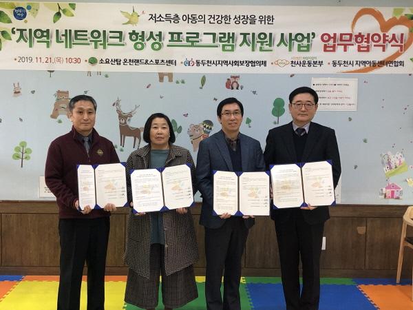 동두천시는 지난 21일 소요산탑온천랜드에서 시 복지정책과장, 지역사회보장 실무협의체위원장 등 관계자 30여명이 참석한 가운데 저소득층 아동을 위한 지역네트워크형성 프로그램지원 사업 업무 협약식을 개최했다.