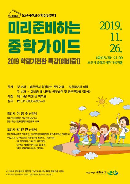 초등학교 6학년을 위한 ‘미리 준비하는 중학가이드’는 오는 26일 오후 6시 30분부터 9시까지 오산중학교 이창수 진로진학상담교사와 ‘자유학년제 이해’라는 주제로 EBS중학프리미엄 박인연 자기주도학습전문강사와 ‘예비중 때 나만의 공부습관 및 공부전략을 잡아라’라는 주제로 진행된다.