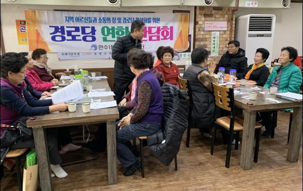 이날 간담회는 경로당 회장·총무 등 12명이 참석한 가운데 어르신들의 애로사항 및 건의사항을 청취하고 경로당 임원진들 간에 서로 인사를 나누며 소통하는 시간을 가졌다.