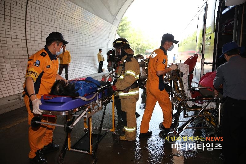 | 지난 5월17일 서독터널 입구 차량추돌로 인한 화재를 가정해 현장대응훈련을 하고 있는 모습.<ⓒ미디어타임즈> |