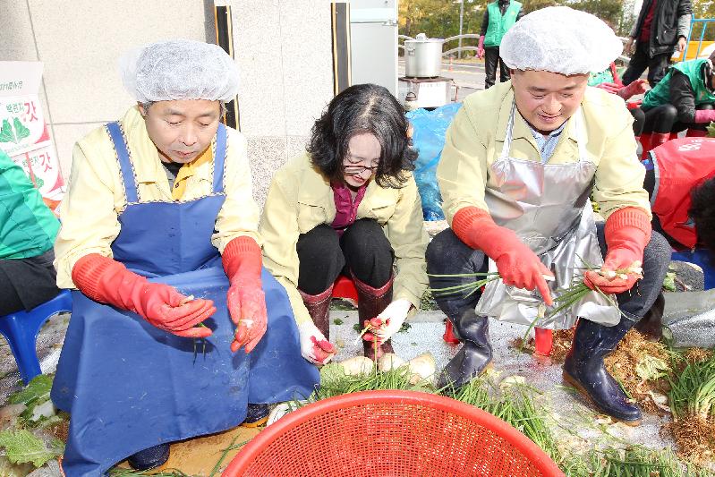 | 16일 광명시의회 김정호 부의장과 나상성 의원이 새마을지도자협의회·부녀회와 함께 배추를 씻고 있다.(사진=광명시의회 제공) |