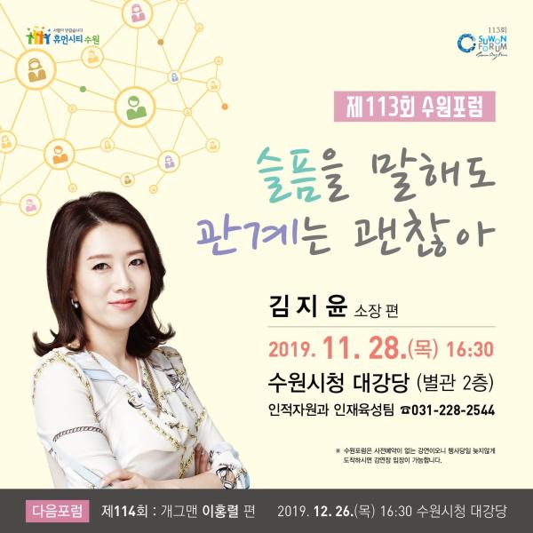 수원시, 28일 오후 4시 30분 시청 대강당에서 제113회 수원 포럼