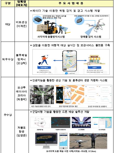 우수상에는 인공지능 기술을 활용해 물류센터 운영의 자동화 기술을 선보인 ‘모션투에이아이코리아’와 군집비행기술을 활용해 드론배송 솔루션을 제공한 ‘파블로 항공’이 선정됐다.