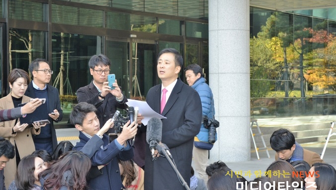 | 박근혜 대통령의 변호인으로 선임된 유영하 변호사가 15일 오후 서울 서초동 고등검찰청 앞에서 기자회견을 열고 취재진 질문에 답하고 있다. <ⓒ미디어타임즈> |