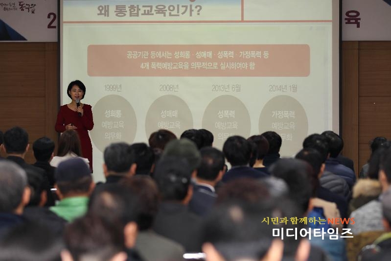 [미디어타임즈=문상수 기자] 인천 동구(청장 이흥수)는 17일 지하대회의실에서 동구청 전 직원을 대상으로 성희롱·성매매·성폭력·가정폭력 예방 및 방지를 위한 ‘공공기관 폭력 예방교육’을 실시했다고 밝혔다. 구에 따르면 이번 교육은 직장에서 성인지 부족으로 발생할 수 있는 성희롱, 성폭력 등의 사고를 미연에 방지해 남녀 상호간 건강한 직장문화를 조성하고자 마련됐으며, 정규직과 비정규직을 포함한 모든 직원들을 대상으로 교육을 실시하기 위해 17~18일 이틀에 걸쳐 진행됐다. 이날 교육은 정인자 한국양성평등교육진흥원 전문강사를 초빙해 ‘함께하는 행복울타리’라는 주제로 강연이 진행됐다. 정인자 강사는 성희롱·성매매·성폭력·가정폭력의 개념과 실태들을 다양한 사례중심 위주 교육으로 진행했으며, 공직사회 내 건전한 가치관 함양을 통한 올바른 성문화 정착 및 서로 인격을 존중하고 배려하는 직장문화 조성을 위한 노력의 필요성을 강조했다. 한편 구 관계자는 “이번 교육이 전 직원의 양성평등 의식 함양과 성에 대한 건전한 가치관 및 성인지 개념 확산에 도움이 되길 바란다”며 “앞으로도 폭력예방 교육을 통해 서로를 배려하고 존중하는 직장문화를 조성하고, 밝고 활력 넘치는 직장 동구를 만들기 위해 최선을 다하겠다”고 말했다.