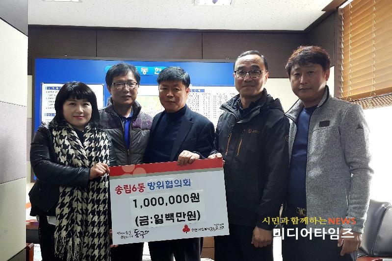 [미디어타임즈=문상수 기자] 송림6동 방위협의회(회장 김경수)는 지난 16일 송림6동 지역사회보장협의체(공동위원장 최호식, 김기범)에 성금 100만원을 전달했다고 밝혔다. 송림6동 방위협의회는 지난 5일 행복한 나눔 기금 마련을 위해 개최한 일일찻집 행사 수입금 100만원을 이날 지역사회보장협의체에 전달했으며, 나머지 금액은 소외되고 어려운 이웃을 위해 쓰일 예정이다. 전달된 성금은 인천광역시 사회복지공동모금회를 통해 송림6동 지역사회보장협의체에 지정 기탁되며, 지역사회보장협의체와 송림6동 방위협의회가 공동으로 주관하는 독거노인 및 저소득층 물품(쌀, 라면, 에너지 바우처등)지원 행사에 사용된다. 한편 송림6동 자유총연맹, 바르게살기위원회, 방위협의회 등 자생단체들은 연말을 맞아 지역사회보장협의체에 복지기금 성금을 전달하며 더불어 함께 살아가는 따뜻한 송림6동 만들기에 앞장서고 있다.
