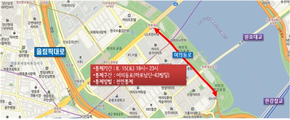 이에 따라 15일(토) 18~23시까지 여의동로(마포대교 남단~63빌딩 앞) 구간이 양방향 차량 통행이 제한된다.