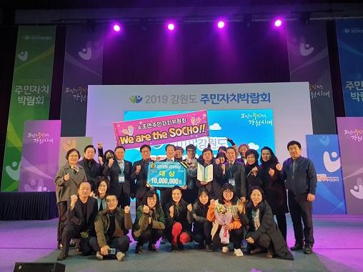 소초면 주민자치위원회가 지난 21일과 22일 양일간 속초시 실내체육관에서 열린 2019 강원도 주민자치박람회에서 ‘2019 강원도 주민자치대상’ 대상을 수상해 상사업비 천만원을 받게 됐다.