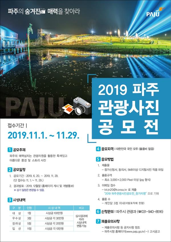 이번 공모전은 관광지, 축제, 전통시장, 자연 및 도시경관, 근·현대 건축물 등을 배경으로 한 아름다운 파주의 모습과 스토리가 담긴 사진이라면 누구나 응모할 수 있다. 제출하는 사진은 2019년 1월 1일부터 2019년 11월 29일 기간 중 촬영한 사진으로 출품자 자신이 저작권을 보유하고 있어야 하며 참가 희망자는 11월 29일까지 공고한 신청서 등을 작성해 이메일로 작품과 함께 제출하면 된다.