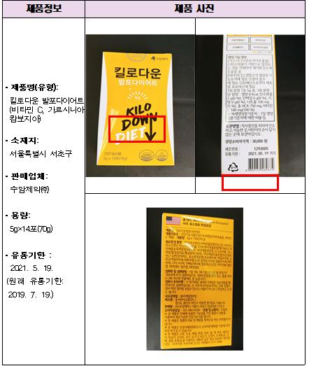 회수 대상은 유통기한이 2021년 5월 19일로 표시된 ‘킬로다운 발포다이어트’ 제품이다.