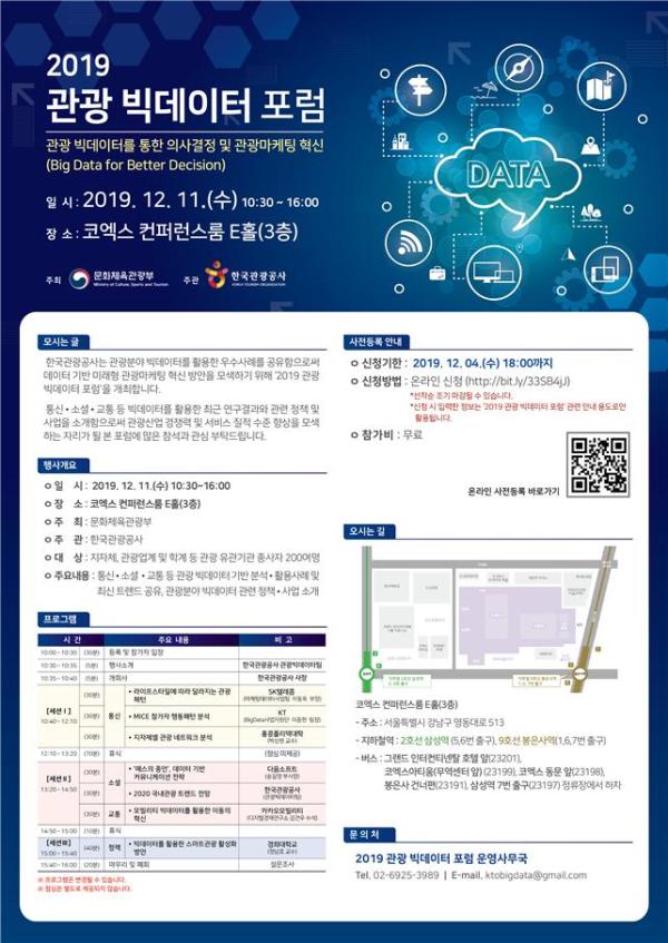 문화체육관광부는 한국관광공사와 함께 오는 12월 11일 코엑스 콘퍼런스룸 이홀에서 ‘2019 관광 빅데이터 포럼’을 개최한다.