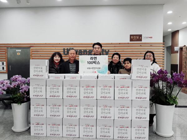 의왕시 내손2동에 위치한 선한이웃교회가 지역의 어려운 이웃들에게 전달해 달라며 지난 25일 라면 100박스를 내손2동 지역사회보장협의체에 기부했다.