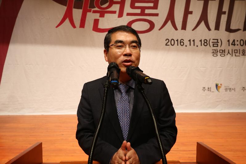 양기대 광명시장은 대회사를 통해 “광명시자원봉사센터는 지난 2003년에 개소하여 13년이 되었고, ‘자원봉사’라는 잔잔한 감동의 물결이 이제는 역동적인 에너지가 되어 사람중심 행복도시 광명의 든든한 초석이 되고 있다고 말하면서, 2016~2018년은 ‘한국자원봉사의 해’로 이에 부흥하여 봉사자들이 좋은 환경에서 보람과 긍지를 가지고 더 즐겁고 더 신명나는 봉사를 하시길 바라며, 최선의 지원을 다해 나갈 것이라”고 했다.