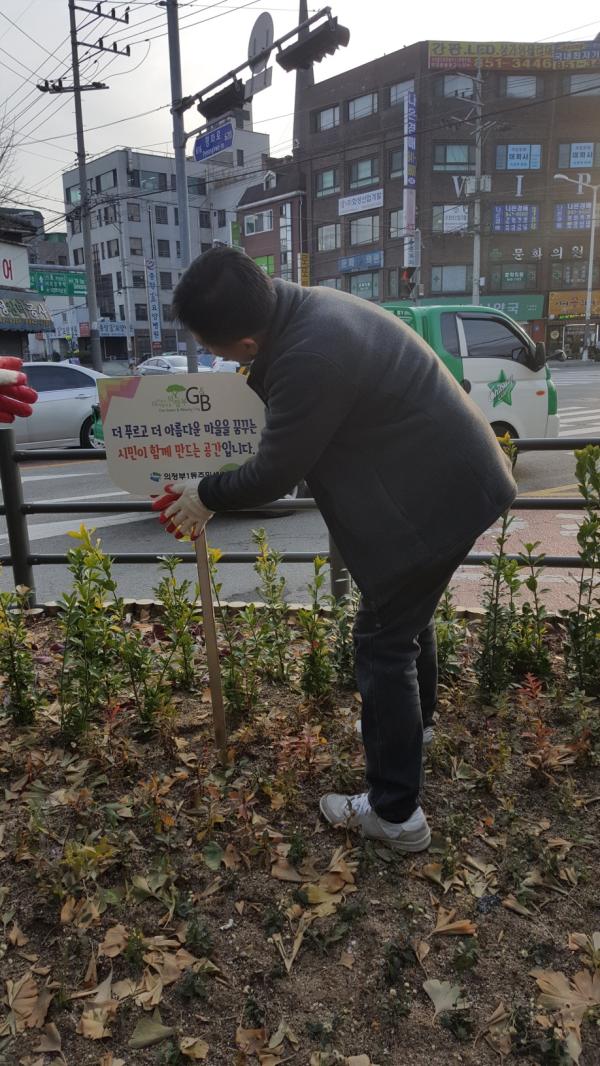 이날 참가자들은 무단투기 지역이었던 가금교 주변 및 중랑천변에 조성된 화단에 ‘더 푸르고 더 아름다운 마을을 꿈꾸는 시민이 함께 만드는 공간이다’라는 안내판을 설치했으며 특히 문화교차로 화단은 겨울철 도로변 염화칼슘 피해를 최소화하기 위해 바람막이를 설치하고 상록의 작은 수목원답게 각종의 상록수와 초화류에 이름표를 붙이는 등 의정부1동의 랜드마크로 자리매김하기 위해 구슬땀을 흘렸다.