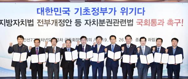 전국시장·군수·구청장협의회 공동회장단은 26일 ‘지방자치법 전부개정안 등 자치분권관련법 국회 통과 촉구문’을 채택했다.