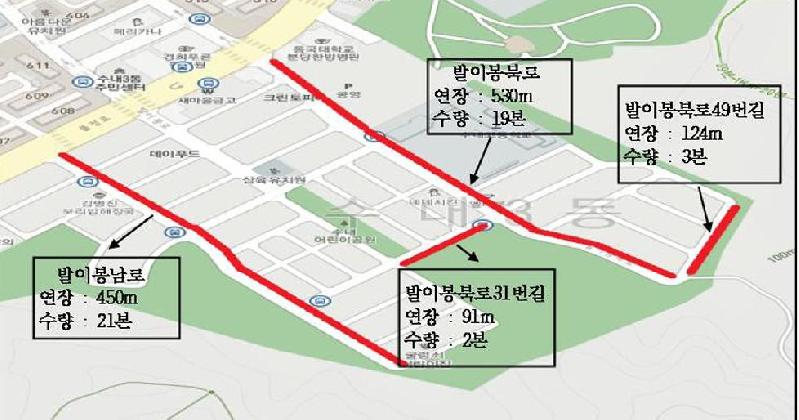 발이봉 남로 450m 구간(21본), 발이봉 북로 530m 구간(19본), 발이봉 북로 31번길 91m 구간(2본), 발이봉 북로 49번길 124m 구간(3본)의 20년 이상 된 가로등과 보안등이 고효율 조명으로 바뀐다.