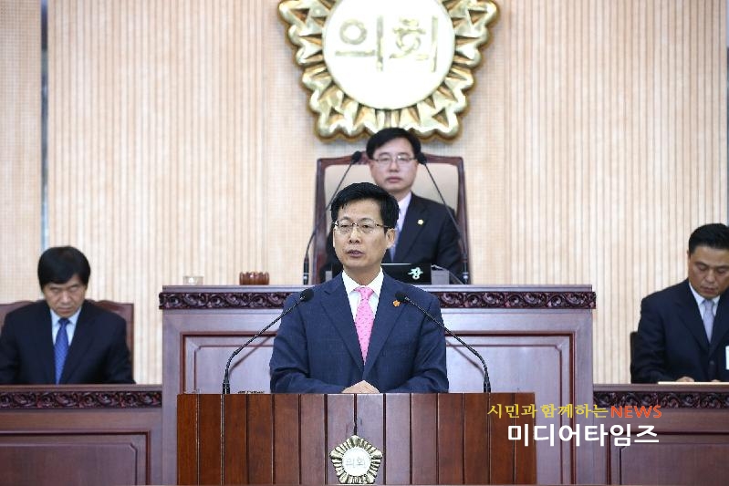 | 21일 최성 시장이 고양시의회에서 2017년 예산안 제안 시정연설을 하고 있다. <사진/ⓒ미디어타임즈> |
