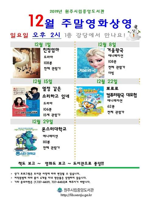 12월에는 어린이와 온 가족이 즐길 수 있는 ‘친정엄마’, ‘겨울왕국’, ‘열정 같은 소리하고 있네’, ‘뽀로로 컴퓨터왕국 대모험’, ‘몬스터대학교’를 매주 일요일 오후 2시 도서관 1층 강당에서 상영한다.