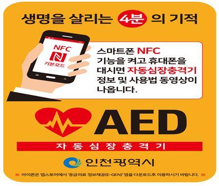 이에 인천시에서는 관내 자동심장충격기 설치 장소의 주출입구 및 설치장소에 자동심장 충격기 정보 전달 홍보스티커를 제작 부착 진행중이다