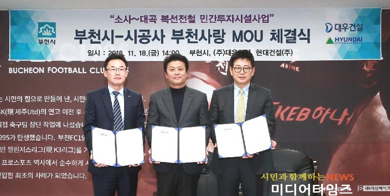 [미디어타임즈= 이영희 기자] 부천시는(시장 김만수) 소사~대곡 복선전철사업과 관련 지난 18일 부천종합운동장 회의실에서 ㈜대우건설, 현대건설㈜과 ‘부천사랑’ MOU를 체결했다.
