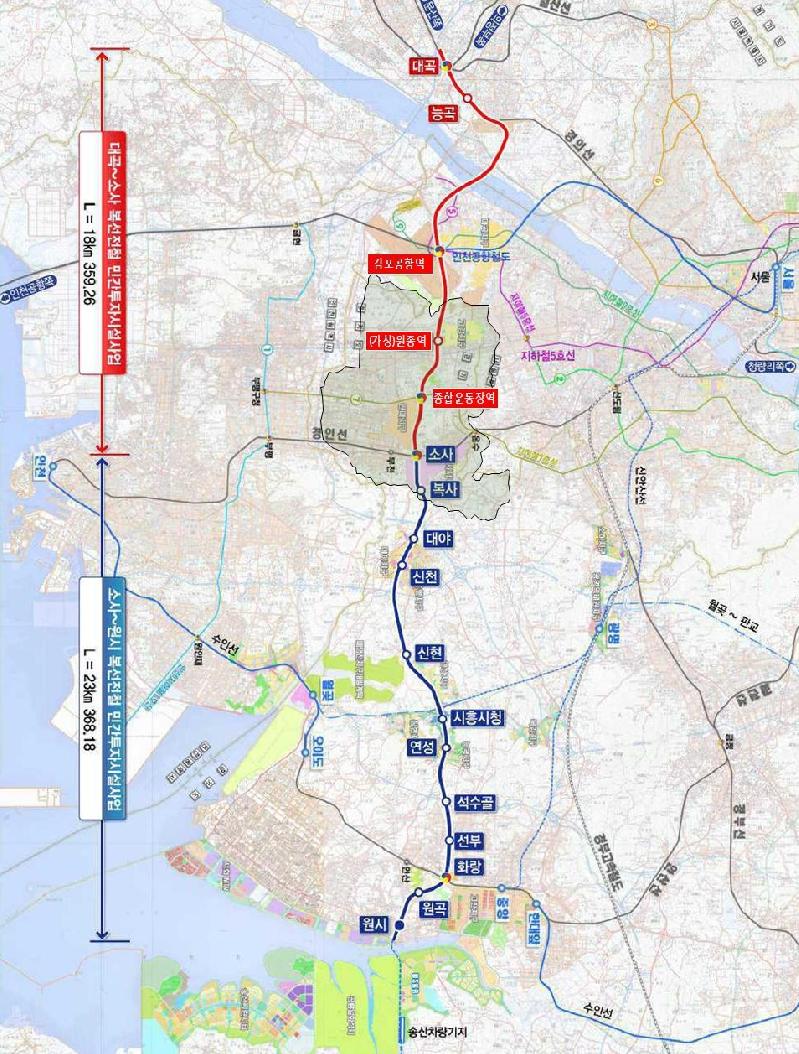 부천 구간은 ㈜대우건설이 4공구 3.40㎞(서울시계~오정경찰서), 현대건설(주)이 5공구 2.88㎞(오정경찰서~소사역)을 맡고, 원종역(가칭)이 신설된다.