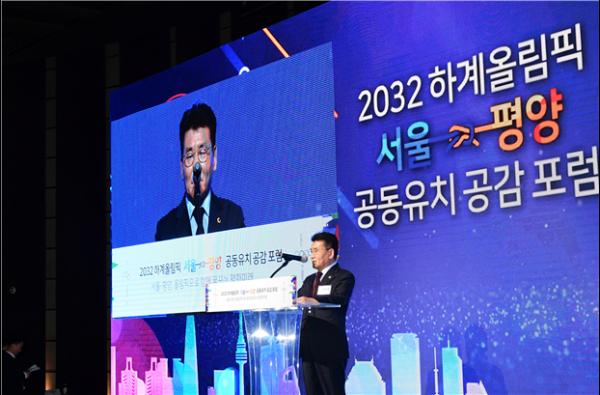 김생환 서울시의회 부의장은 축하의 말씀에서 “2032년 서울과 평양 하계올림픽 공동유치를 위한 포럼이 개최된 것을 뜻깊게 생각한다”고 전하며 “올해 제100회 전국체전이 서울에서 개최되었는데 정말 기쁘고 감격스러운 순간이었으나 북한의 선수들이 함께하지 못한 아쉬움이 있었다”는 감회를 전했다.
