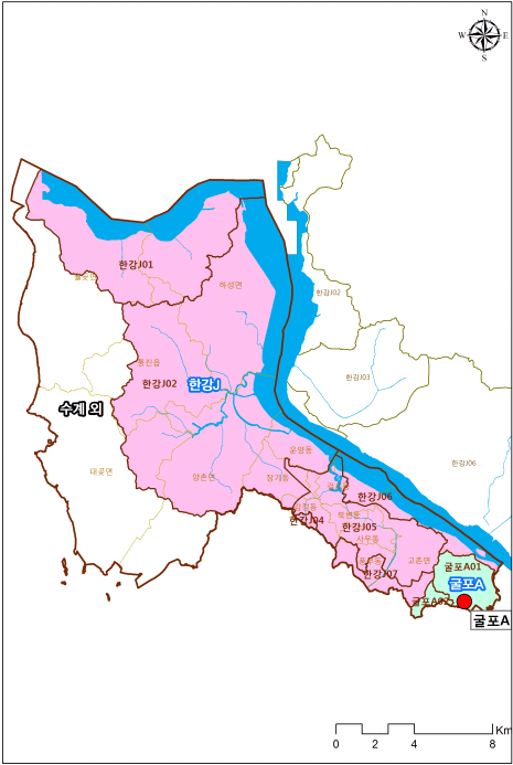 김포시는 한강수계 지역은 전체 면적 중 70%에 해당하는 195㎢로 굴포A, 한강J 총 2개의 단위유역으로 구분해 관리하고 있다.