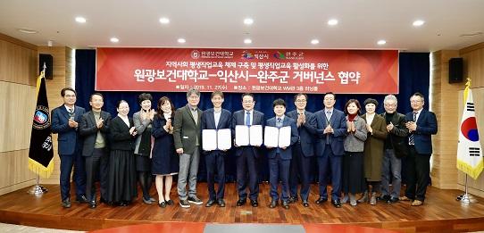 익산시는 27일 완주군, 원광보건대학교가 참석한 가운데 원광보건대학교 WM관 3층 회의실에서 평생 직업교육 체계구축과 활성화를 위한 업무협약을 체결했다.