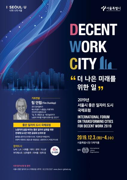서울시는 12월 3일~4일 양일간 서울시청 다목적홀에서 ‘2019년 좋은 일자리 도시 국제포럼’과 포럼 참여도시를 중심으로 한 ‘좋은 일자리 도시협의체 창립총회’를 개최한다고 밝혔다. 이번 행사는 국제노동기구의 협력으로 진행된다.