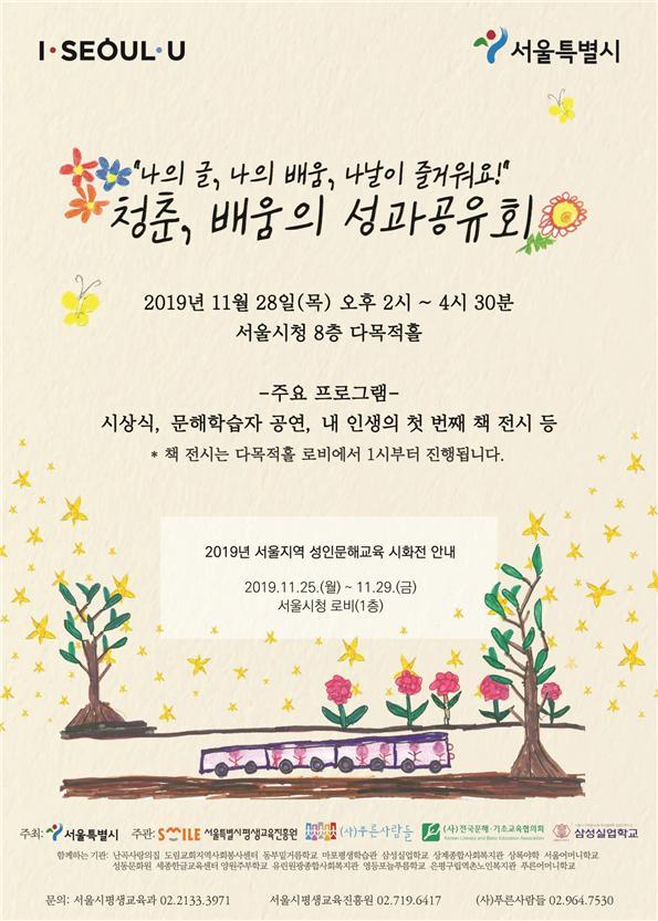 서울시는 금년 6월 발표한 “성인문해교육 활성화 4개년 종합계획”에 따라 서울시평생교육진흥원, 푸른사람들 등 15개 교육기관과 함께 오는 28일 오후 2시 서울시청 8층 다목적홀에서 ‘청춘, 배움의 성과공유회’를 개최한다.