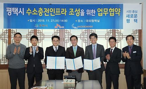 평택시가 27일 시청 대외협력실에서 SK에너지, 수소에너지네트워크와 평택시 수소충전인프라 조성을 위한 업무협약을 체결했다.