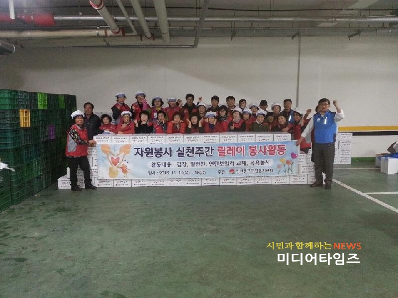 [미디어타임즈=문상수 기자] 인천중구자원봉사센터(소장 이주영)는 11월 10일부터 11월 18일까지 『자원봉사실천주간 릴레이 봉사활동』을 전개했다. 이번 활동은 지난 10일 무의도 어르신 목욕 봉사(18명)활동을 시작으로 밑반찬 나누기(156세대), 김장김치 담가 나누기(330세대), 연탄보일러 교체(4세대) 등 총 508세대에 종합서비스를 제공했다. 특히, 이번 봉사활동에는 동자원봉사센터 상담가, 인천해양경비안전서 511함 소속 경찰관, 참! 좋은 사랑의 밥 차 봉사단 등 총 100여명이 참석하여 성황리에 봉사활동을 마무리했다. 김장 담그기에 참여한 이00 氏는 “매년 여러 기관에서 진행하던 김장사업이 축소되거나 없어져 사회 취약계층에 전달할 수량이 많이 부족하다는 말을 들었는데 중구자원봉사센터에서 진행한 김장 봉사활동을 계기로 이 부분이 많이 해결되었으면 좋겠다”는 소감을 밝혔다. 중구자원봉사센터 관계자는 “추운 겨울 사회 취약계층이 조금이라도 더 따뜻하게 겨울을 지낼 수 있도록 다양한 봉사활동을 지속적으로 전개할 계획”이라고 말했다.