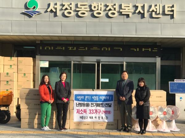 평택시 서정동 관내 산업용 자재 판매업체인 대흥공구는 연말을 맞아 관내 홀몸 어르신 등 저소득 가구 33세대에 전기매트를 전달했다.