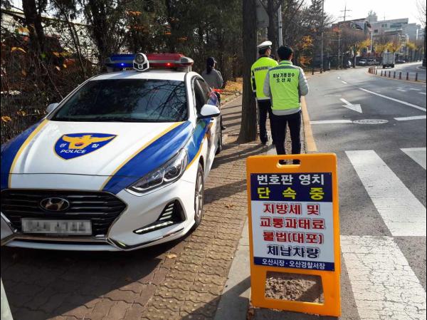 이번 합동 영치활동은 오산경찰서의 참여로 시에서 새로 도입한 체납차량 실시간 무선알림단속시스템과 국도변에 설치한 불법차량 단속 CCTV를 활용해 국도변 등 차량 밀집지역과 차량 이동이 많은 도로변에서 단속활동을 펼쳤다.