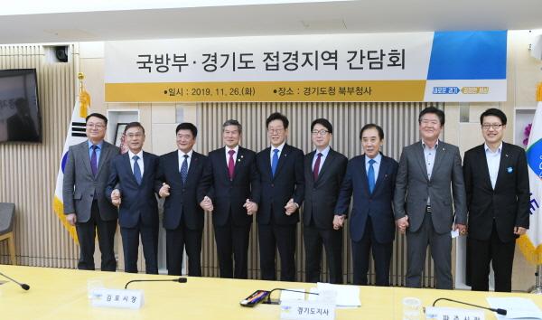 이날 간담회는 김포시 등 군사시설이 밀집한 경기도 북부지역 7개 지자체 시장·군수와 이재명 경기도지사, 정경두 국방부 장관이 참석해 군사시설보호를 위한 규제로 인한 주민피해 해소와 지역경제 활성화를 위한 현안이 논의됐다.