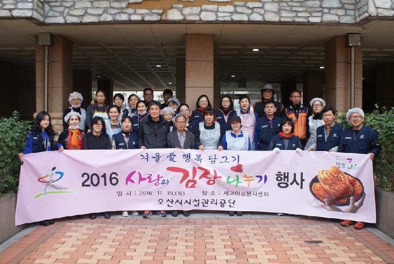 공단은 세교마을봉사센터에서 임·직원 및 자원봉사자들과 함께 600킬로그램(kg)의 김치를 담갔으며, 김장 비용은 공단 임·직원이 자발적으로 월급의 일부를 기부하는 ‘사랑의 마음 모으기’로 마련됐다.