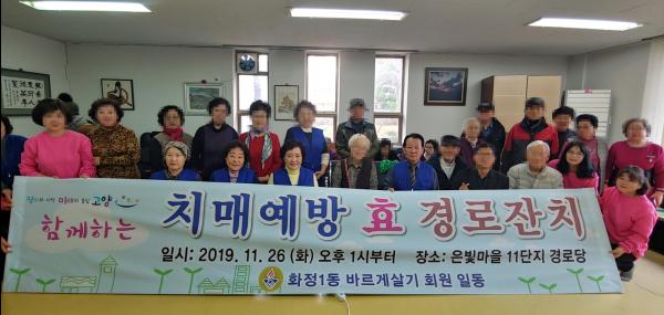 고양시 덕양구 화정1동 바르게살기협의회는 지난 26일 화정1동 은빛마을 11단지 경로당에서 어르신들에게 치매예방을 위한 율동을 알려드리는 등 어르신들의 건강 및 장수를 기원하는 ‘치매예방 효 경로잔치’를 개최했다.