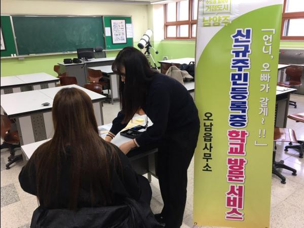 오남읍사무소는 학교를 직접 방문해 주민등록증을 발급해주는 서비스를 매년 상·하반기에 걸쳐 실시하고 있으며 읍 주민센터를 방문하는 부담이 없어 학생 및 학부모 모두로부터 많은 호응을 받고 있다.