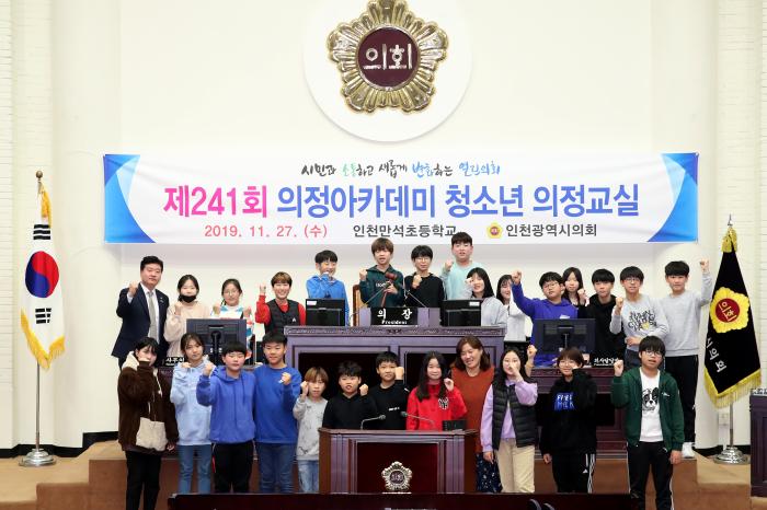 인천광역시의회(의장 이용범)가 27일 개최한 제241회 의정아카데미 청소년 의정교실에 인천만석초등학교(동구 제물량로 소재) 학생회 임원 26명이 참가했다.